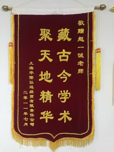 藏古今学术  聚天地精华    2011年上海华隆弘达经贸有限公司敬赠赵一诚老师 锦旗