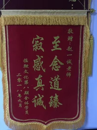至念道臻  寂感真诚    2018年摇鞭文化第八期全体学员敬赠赵一诚老师锦旗